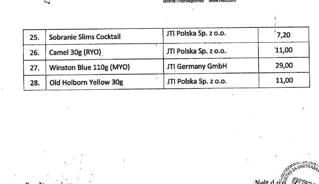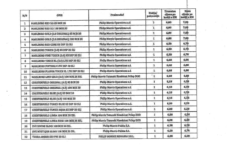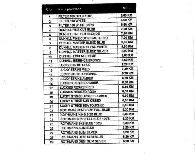 Nove cijene cigareta Upravi za indirektno oporezivanje (UIO) BiH dostavili su „TDR“ Sarajevo, „Filip Mors“, te „Nelt“.